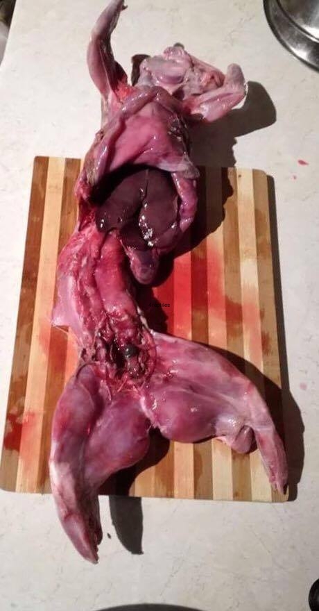 Kaninchenkarkasse mit Kopf und Innereien.